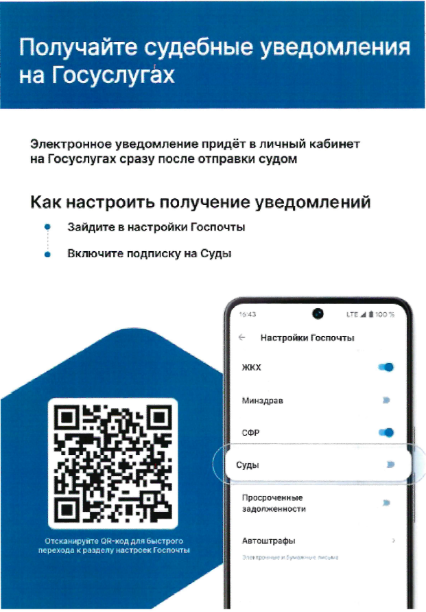 Судебные уведомления можно получать с помощью сервиса государственных услуг Российской Федерации, используя QR-код для перехода на страницу Госуслуг.
